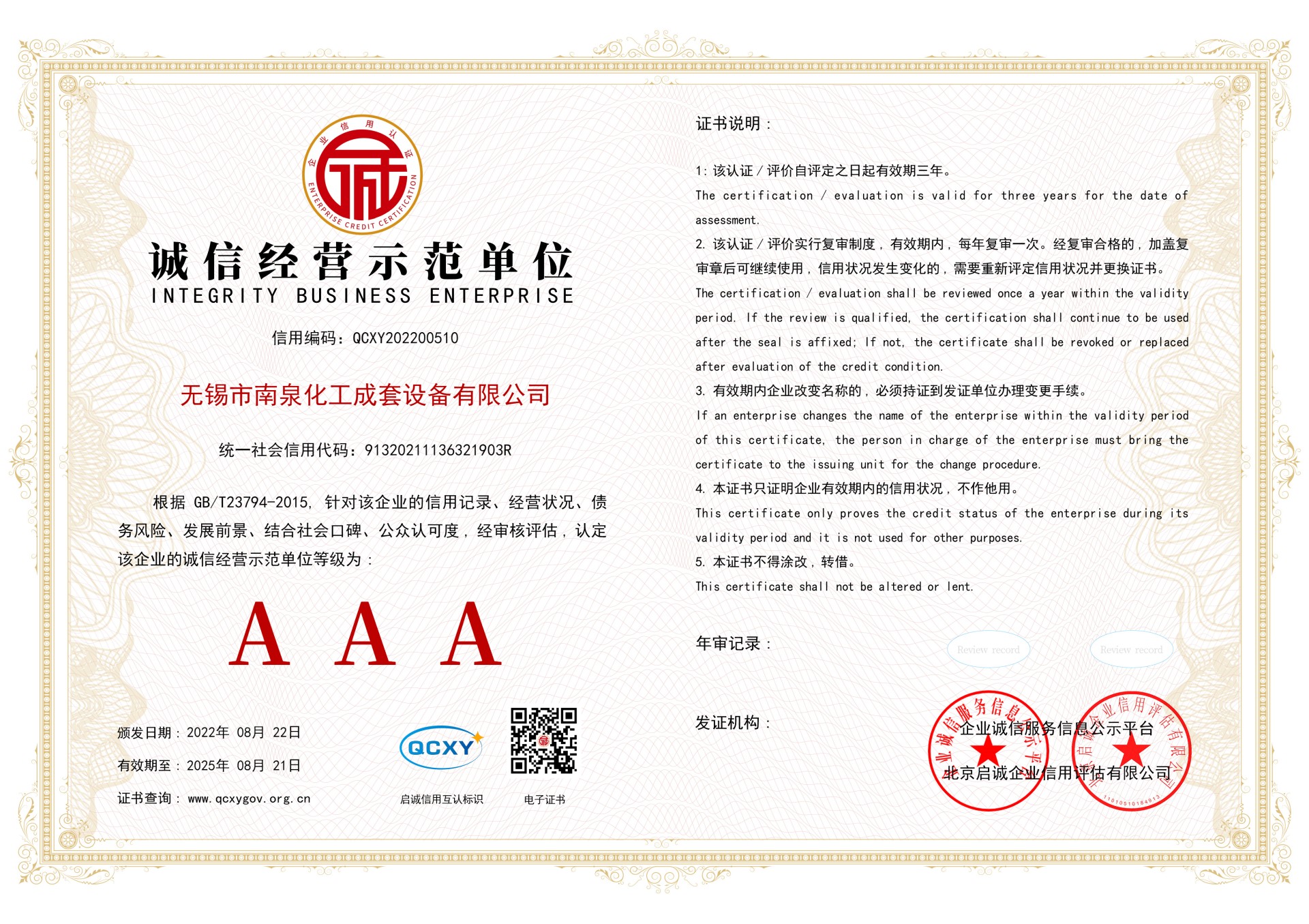 证书介绍 证书说明: 1:该认证 / 评价自评定之日起有效期三年。 The certification / evaluation is valid for, three years for the date of assessment. 2. 该认证 / 评价实行复审制度,有效期内,每年复审一-次。经复审合格的,加盖复审章后可继续使用,信用状况发生变化的,需要重新评定信用状况并更换证书。 The certification / evaluation shall be reviewed once a year within the validity period. If the review is qualified,the certification shall continue to be used after the seal is affixed; If not, the certificate shall be revoked or, replaced after evaluation of the credit condition. 3. 有效期内企业改变名称的,必须持证到发证单位办理变更手续。 If an enterprise changes the name of the enterprise within the validity per iod of this certificate, the person in charge of the enterprise must bring the certificate to the issuing unit for the change procedure. 4. 本证书只证明企业有效期内的信用状况,不作他用。 This certificate only proves the credit status of the enterprise during its validity period and it is not used for other purposes. 5. 本证书不得涂改,转借。 This certificate shall not be altered or lent. 证书图片 |